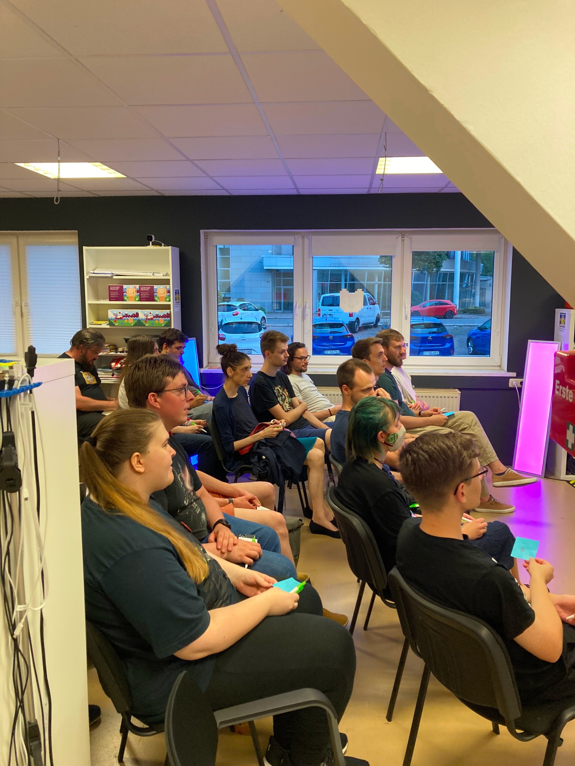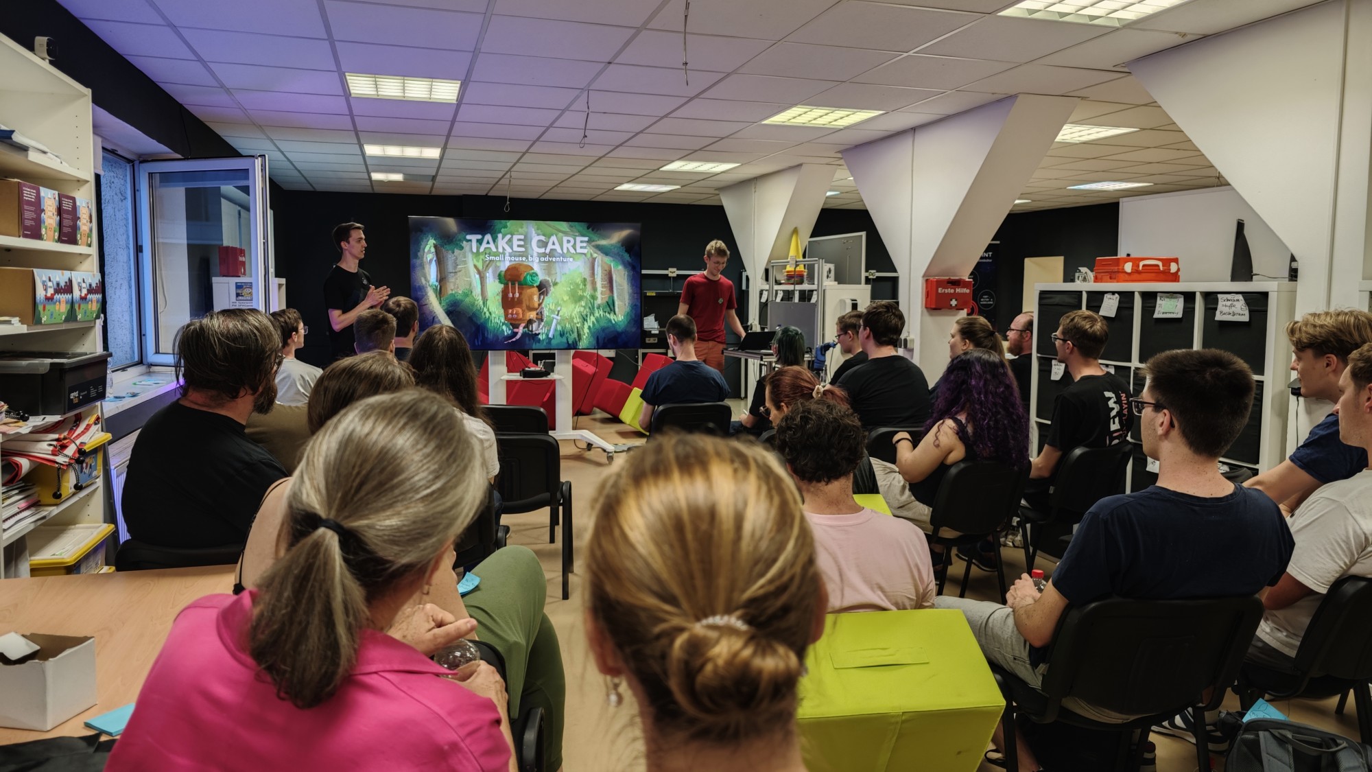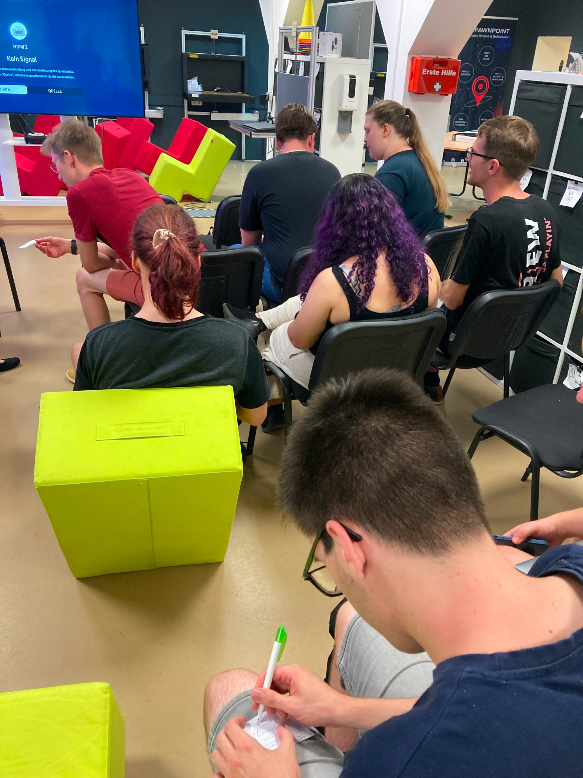 Wie auf den Fotos zu sehen, war unser barrierefreier Makerspace voll mit Akteuren und Akteurinnen aus der Thüringer Gamesbranche, die sich zu einem tollen Austauch über unser aller Leidenschaft und Beruf getroffen haben. Neben spannenden Inputs wurden auch Spieleideen gepitcht, Spiele ausprobiert und sogar ein Forschungsprojekt vorgestellt.