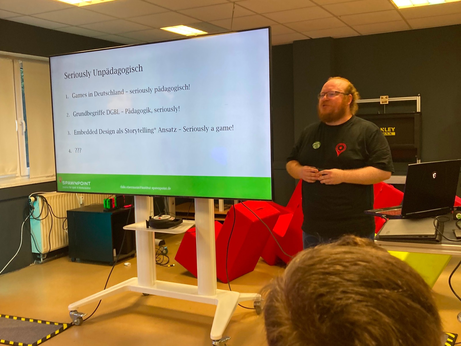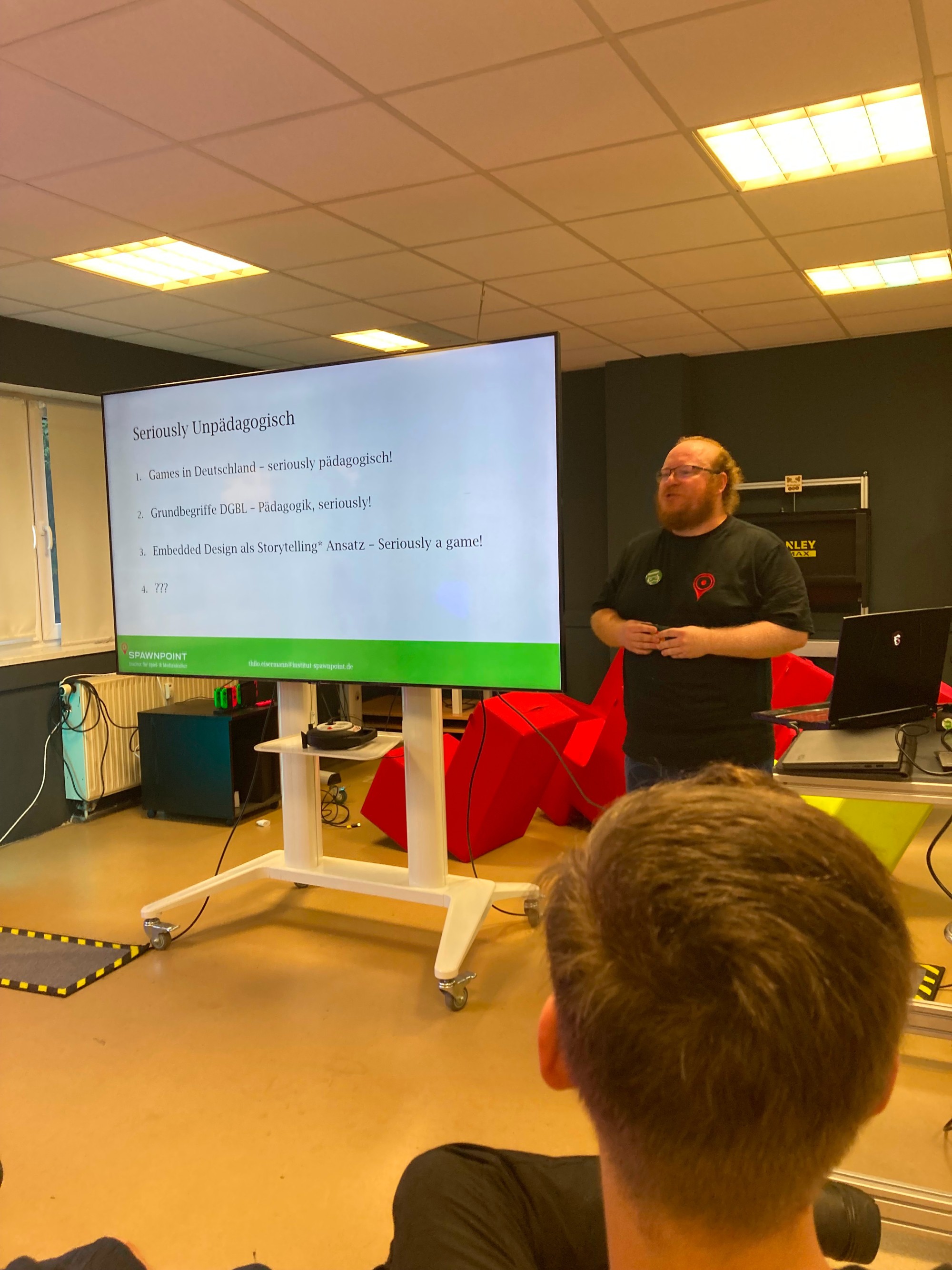 Thilo Eisermann vom Institut Spawnpoint gibt einen kurzen, interaktiven Input zum Thema „Serious Games und Embedded Design“. Basierend auf Grundlagen des Digital Game Based Learning werden verschiedene Ansätze diskutiert, Spiele mit „Mehrwert“ zu gestalten.