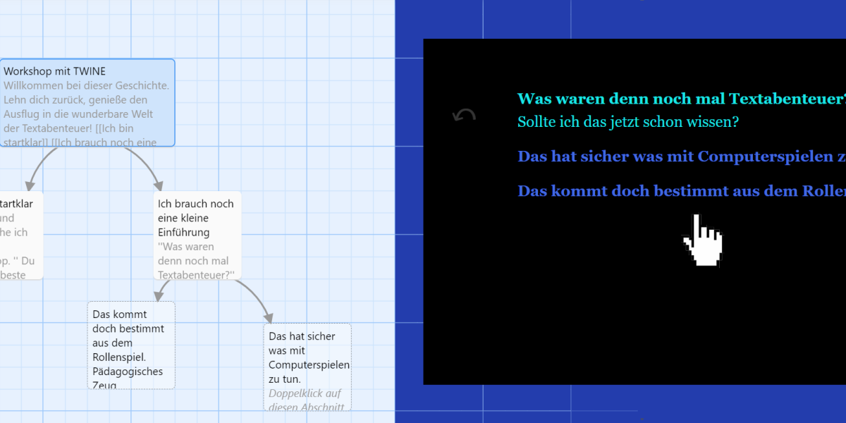 Der Umgang mit einem Thema oder mit einer Fragestellung kann auf verschiedene Weisen passieren. Bei einem Workshop mit „TWINE“ (https://www.bildung.digital/artikel/interaktive-geschichten-erzaehlen-mit-twine) erstellen wir gemeinsam Interaktive Geschichten. In diese digitalen Stories können wir Entscheidungsmöglichkeiten, Infos, Bilder und Texte einbinden. Diese Spiel-Elemente vermitteln der spielenden Person - Stück für Stück - ein Problem oder eine Geschichte. Ähnlich, wie bei einem textbasierten Abenteuer-Spiel, werden hier mit Maus und Tastatur Welten erkundet, die erst in der eigenen Vorstellung zu fertigen Szenen werden.